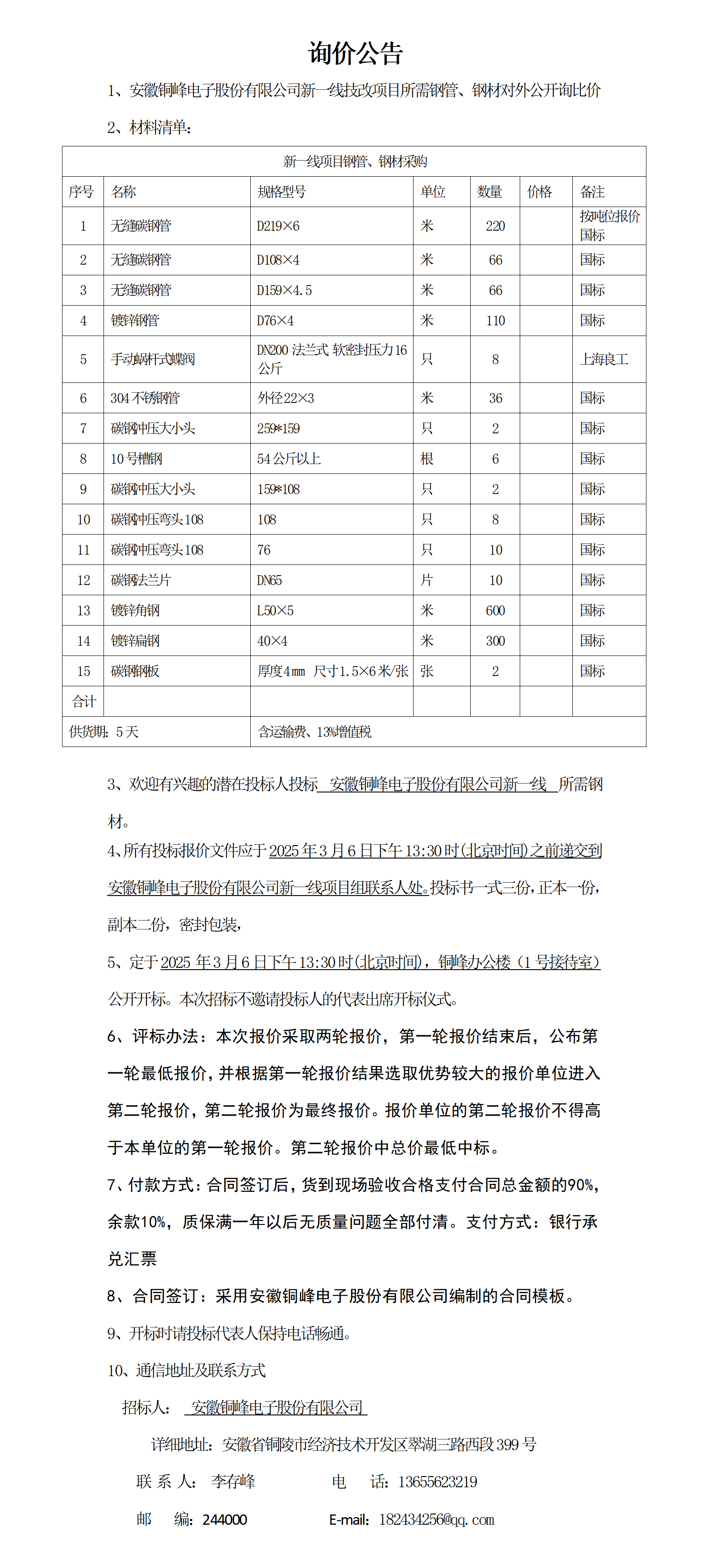 安徽銅峰電子股份有限公司新一線項(xiàng)目鋼材詢價公告_01