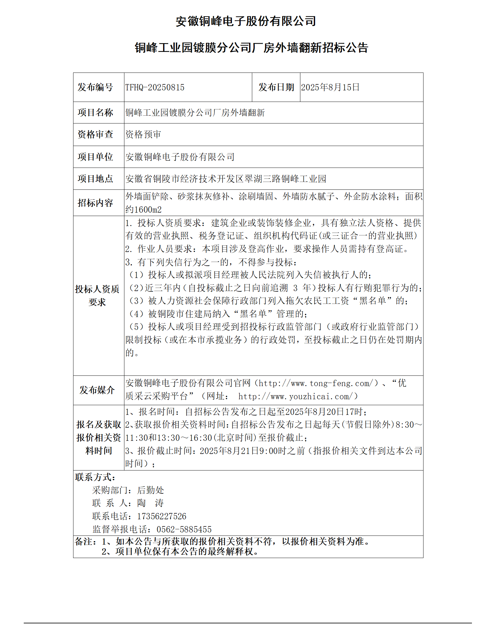 安徽銅峰電子股份有限公司 (鍍膜分公司廠房外墻翻新招標公告)_01