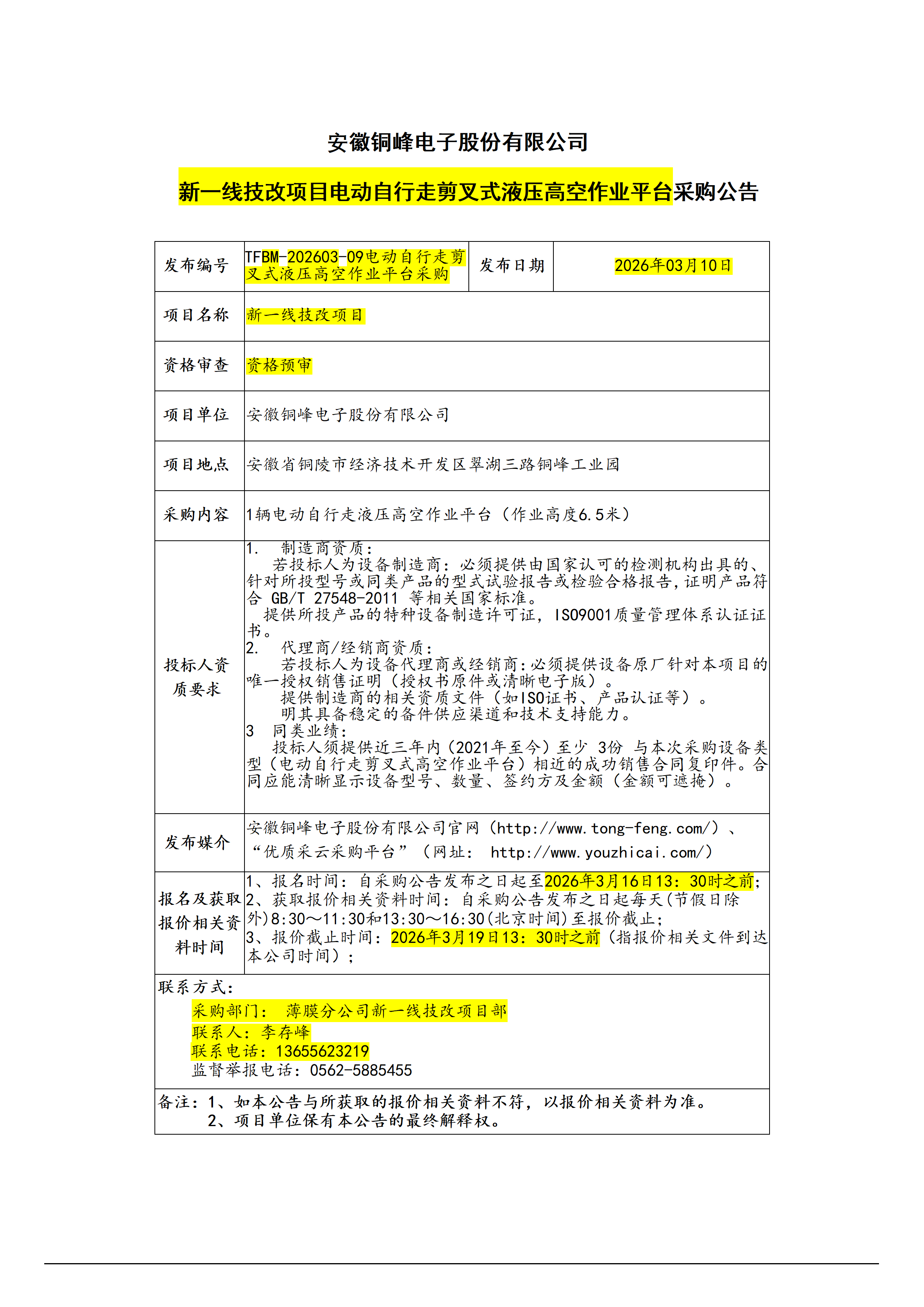 安徽銅峰電子股份有限公司 (新一線電動(dòng)登高車(chē)采購(gòu)招標(biāo)公告)_01